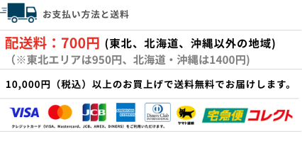 クレジットカード(VISA,MASTER,JCB,AMEX,DINERS)と、お届け時の代金引換がご利用いただけます。商品価格合計で10000円以上の場合、送料無料となります。詳細は