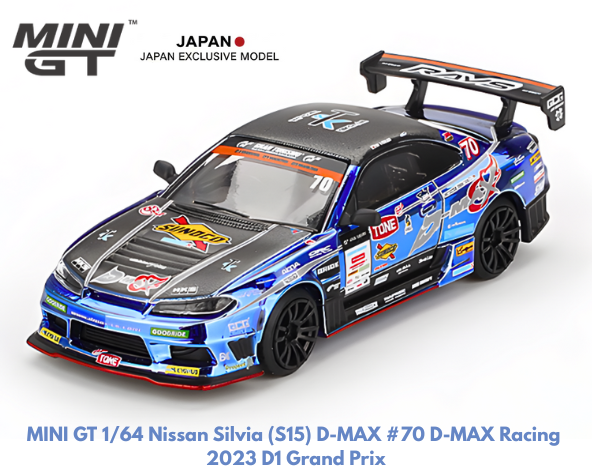 2023年にD1GPシリーズ参戦していた横井昌志選手が乗る「No70 TEAM D-MAX S15 SILVIA」を再現したMINI GTの1/64スケールミニカーです。ブリスターパッケージ仕様で日本市場向けの限定モデルとなっています。